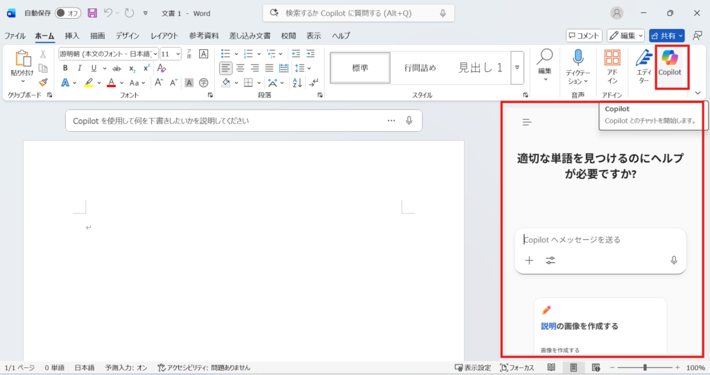 Word内のドキュメント内にある「Copilotを使用して何を下書きしたいか説明してください」の欄にプロンプトを入力して使用することができます。