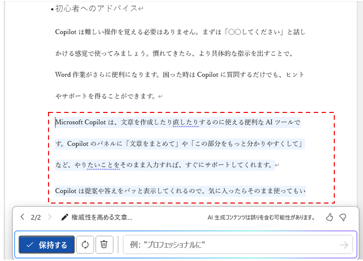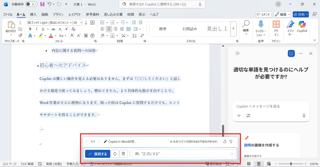 Copilotが提案する文章をベースに調整するだけで、効率的かつ洗練された文書を完成させることができます。さらに、Copilotは単なる文章生成ツールではなく、アイデアを広げ、より良い表現や構成を提示してくれる頼もしいパートナーです。