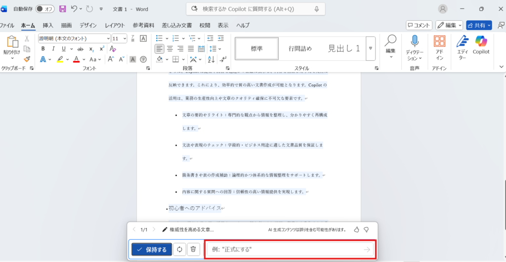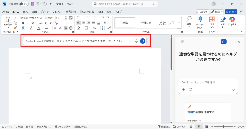 Wordのドキュメント内にあるプロンプト生成画面に『Copilot in Wordの使い方について、初心者にもわかる説明文を生成してください』と入力します。