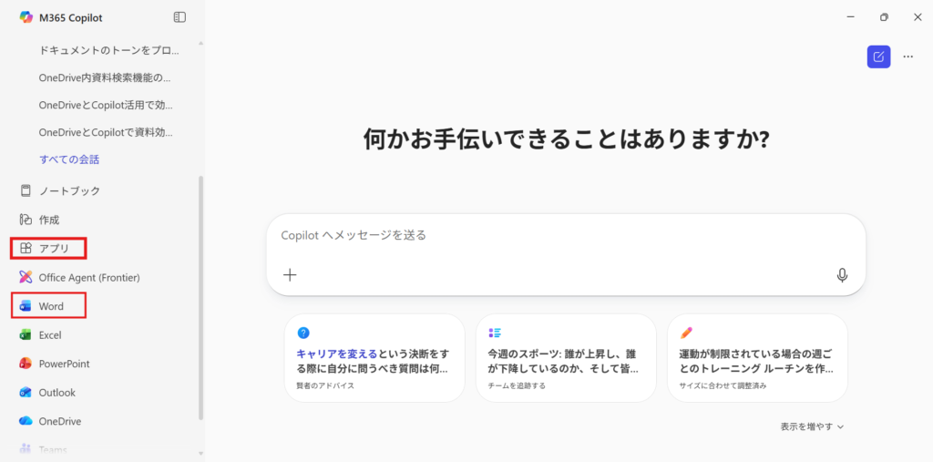 M365アプリから「アプリ」から「Word」をクリックしてWordを開きます。