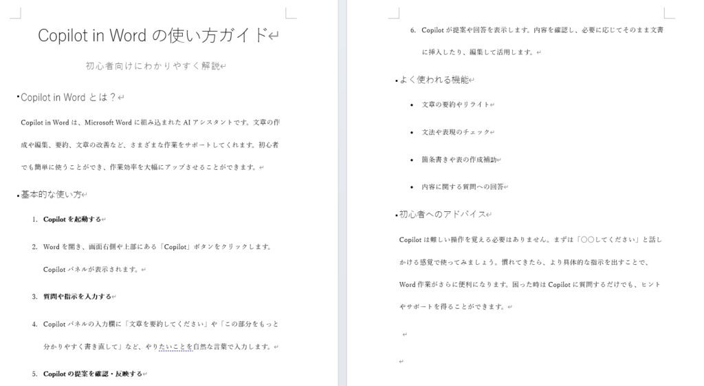簡単なプロンプトだけで、Copilot in Wordに関する情報を概要から手順までを生成してくれます。