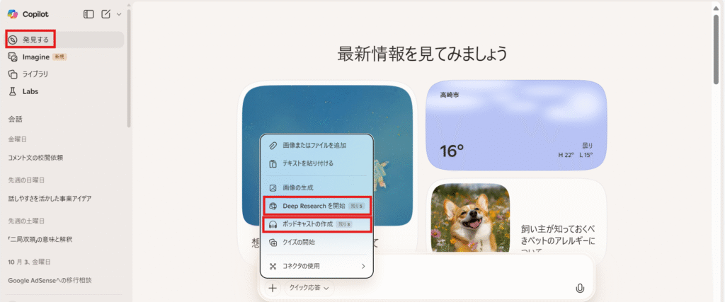 今回のテーマはCopilotのUI上の「発見する」の項目を説明していきます。