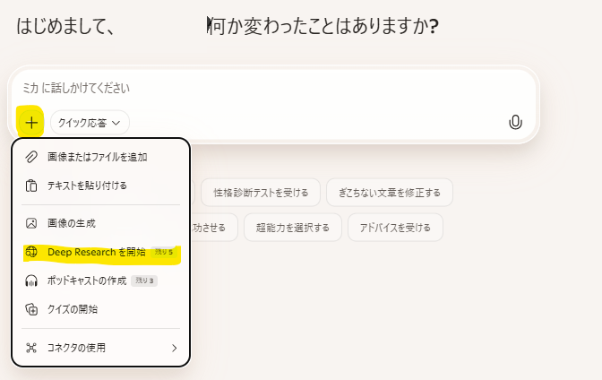 ₊ボタンを押して→「DeepResaarchを開始」をクリック
