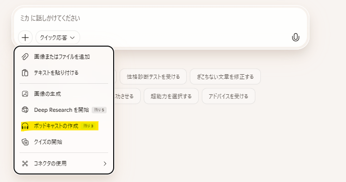 2025年10月の無料版Copilotのアップデートは、業務効率化の核となる技術の「試験運用」が目立ちます。 今回はDeepResaarchは利用できそうですが、回数制限などあります。そのほかポットキャストは、例えば通勤電車の中で知りた内容を音声にして出力して聞き流すなどの活用方法があると思いました。またCopilotとの会話に関しては私の中では活用方法は今一つ見いだせなかったです。