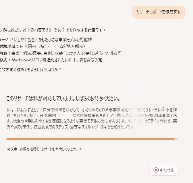• AIが自動で複数の情報源を調査・分析し、構造化されたレポートを生成してくれる機能です。