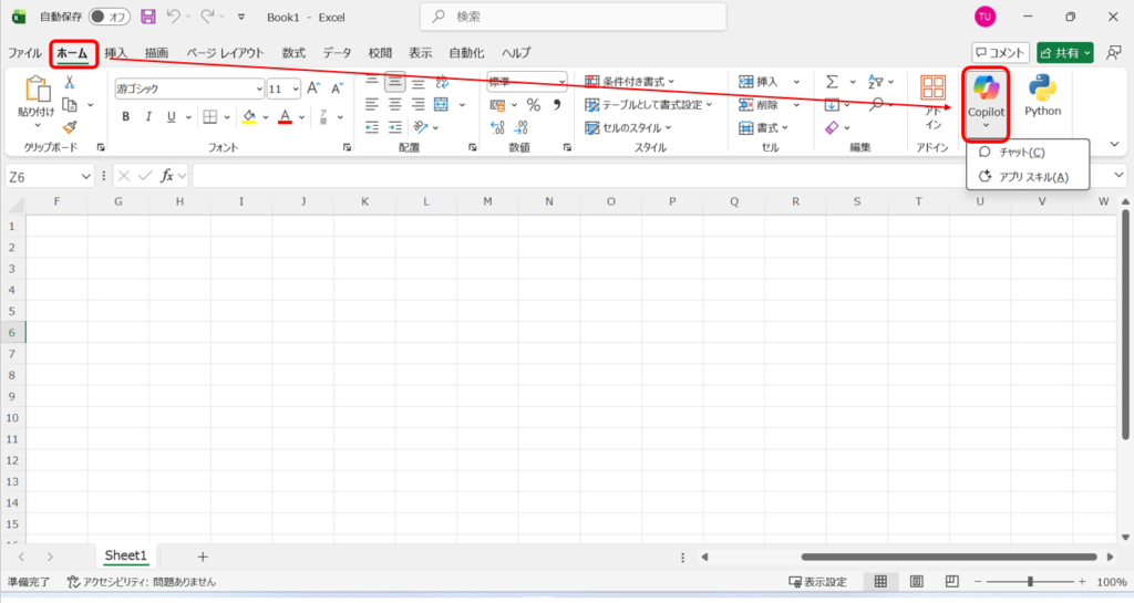 「ホーム」→「Copilot」をクリックするとCopilotが起動します。