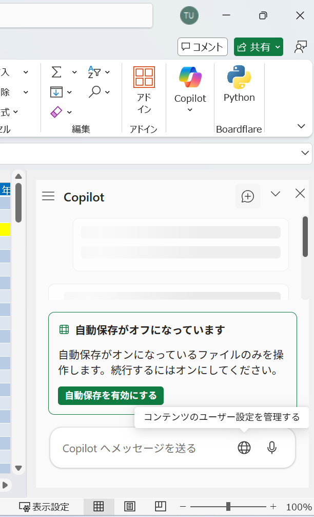 Copilotを利用するには、OneDriveなどのクラウドストレージにファイルを保存する必要があります。Copilotボタンを押した際に以下のメッセージが表示された場合は、ファイルをOneDriveに保存してください。