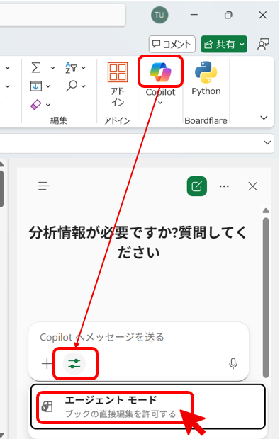 「Copilot」→ツールボタンをクリックすると「エージェントモード」が表示されます。