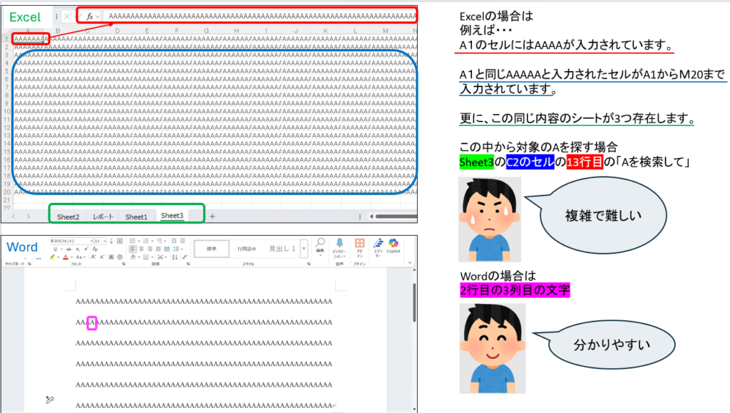 Excelは無限に広がる世界が「シート」「セル」「値(セルの中)」の3つあり、検索が複雑になります。