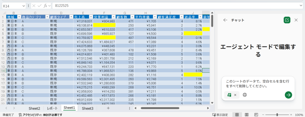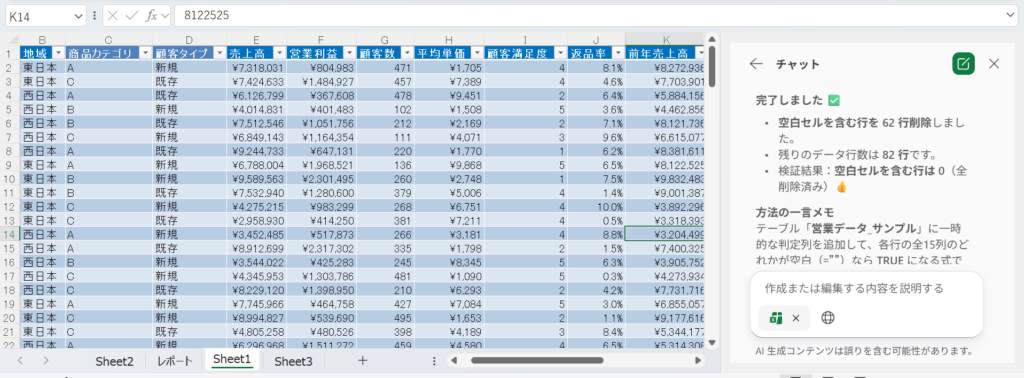 「このシートのデータで、空白セルを含む行をすべて削除してください。」とプロンプトを入力します
