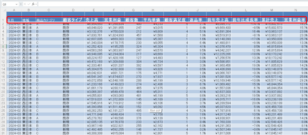 このデータは売上データとなります。赤の枠で囲んでいるように顧客数や売上高などが入力されています。