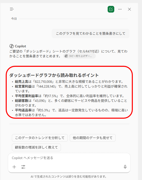 Copilot Cthatで「グラフから読み取れるポイントを教えて」と入力するとポイントを教えてくれました。