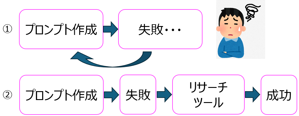 プロンプトを入力しても期待通りの結果が得られない場合、②のリサーチツールを活用してプロンプトを作成することで、より精度の高い結果を得られる可能性があります。