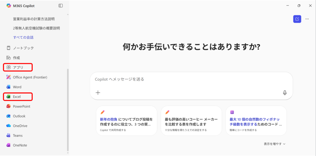 Ⅿ365 Copilotアプリから、「アプリ」→「Excel」を選択してExcelを起動します。