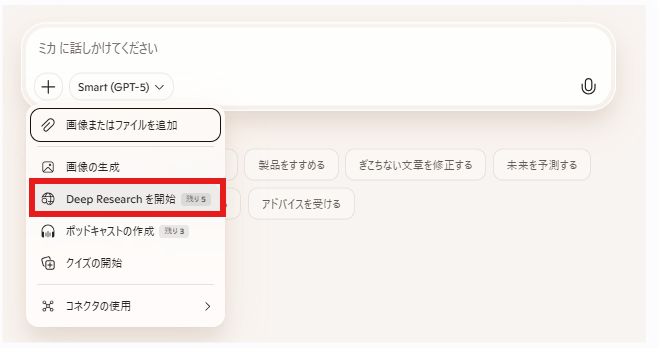 - プロンプト入力画面の「₊」ボタンを押すと「Deep Researchを開始」を選びます。
