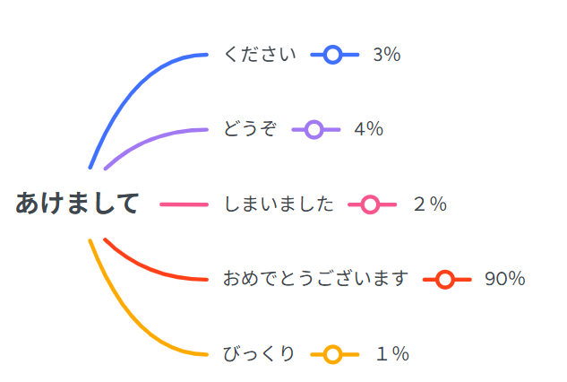 このあけましての後に続く言葉に対し90%の確率だから、「おめでとうございます」が適切あると判断し答えを生成するようになっています。