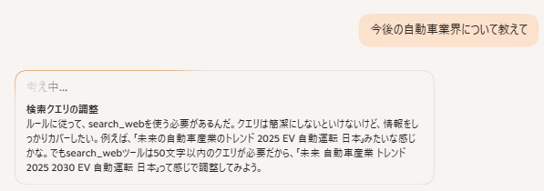 プロンプトを実行すると「考え中」と表示され思考プロセスを表示してくれます。