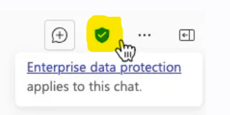 エンタープライズ保護機能機能が有効になっている場合は「データは基礎モデルのトレーニングには使用されません。」エンタープライズ保護機能の有効の有無はCopilot画面の上部に矢印で示したアイコンが表示されます。